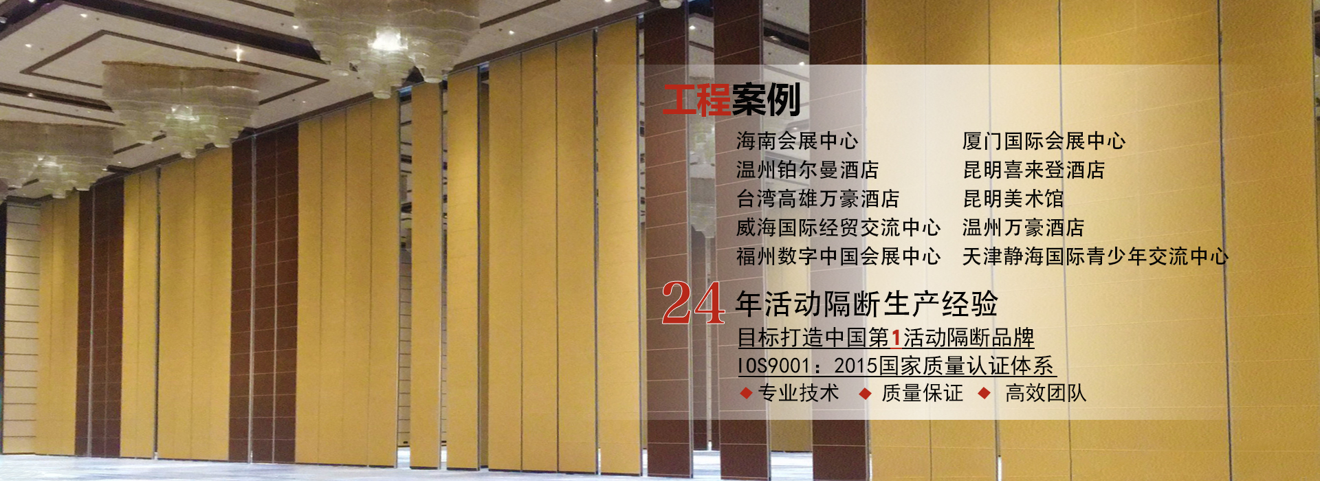 廣東一固隔斷制品有限公司成立于1998年,國(guó)家高新技術(shù)企業(yè),位于中國(guó)佛山市南海區(qū)里水鎮(zhèn),是一家專業(yè)從事活動(dòng)隔斷和辦公室玻璃隔斷系統(tǒng)開發(fā),銷售,生產(chǎn)和售后服務(wù)的一站式生產(chǎn)廠商。公司產(chǎn)品廣泛應(yīng)用于星級(jí)飯店,寫字樓,餐廳,宴會(huì)廳,會(huì)議中心或會(huì)展中心等商業(yè)場(chǎng)合,提供便捷有效的空間管理解決方案。最高門板高度可達(dá)20米,最大隔音系數(shù)可達(dá)56分貝。 一固公司擁有兩個(gè)現(xiàn)代化的生產(chǎn)基地,占地超過10,000平方米,...